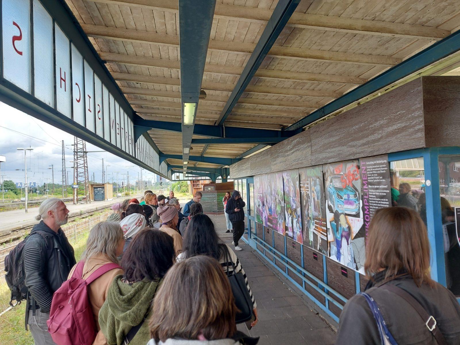 Auch unser wöchentliches Frauenfrühstück stand im Zeichen von #keinkompliment und bot Raum für Austausch und Vernetzung. Im Anschluss daran besuchte die Künstlerin Carina Hommel gemeinsam mit den Teilnehmerinnen und weiteren interessierten Menschen aus Oberhausen die Ausstellung auf dem Museumsbahnsteig. Beim Betrachten und Reflektieren der Bilder entstand ein intensiver Austausch über eigene Erfahrungen und Möglichkeiten des Selbstschutzes. Der Ausstellungsbesuch endete mit einer gemeinsamen Sprayaktion.