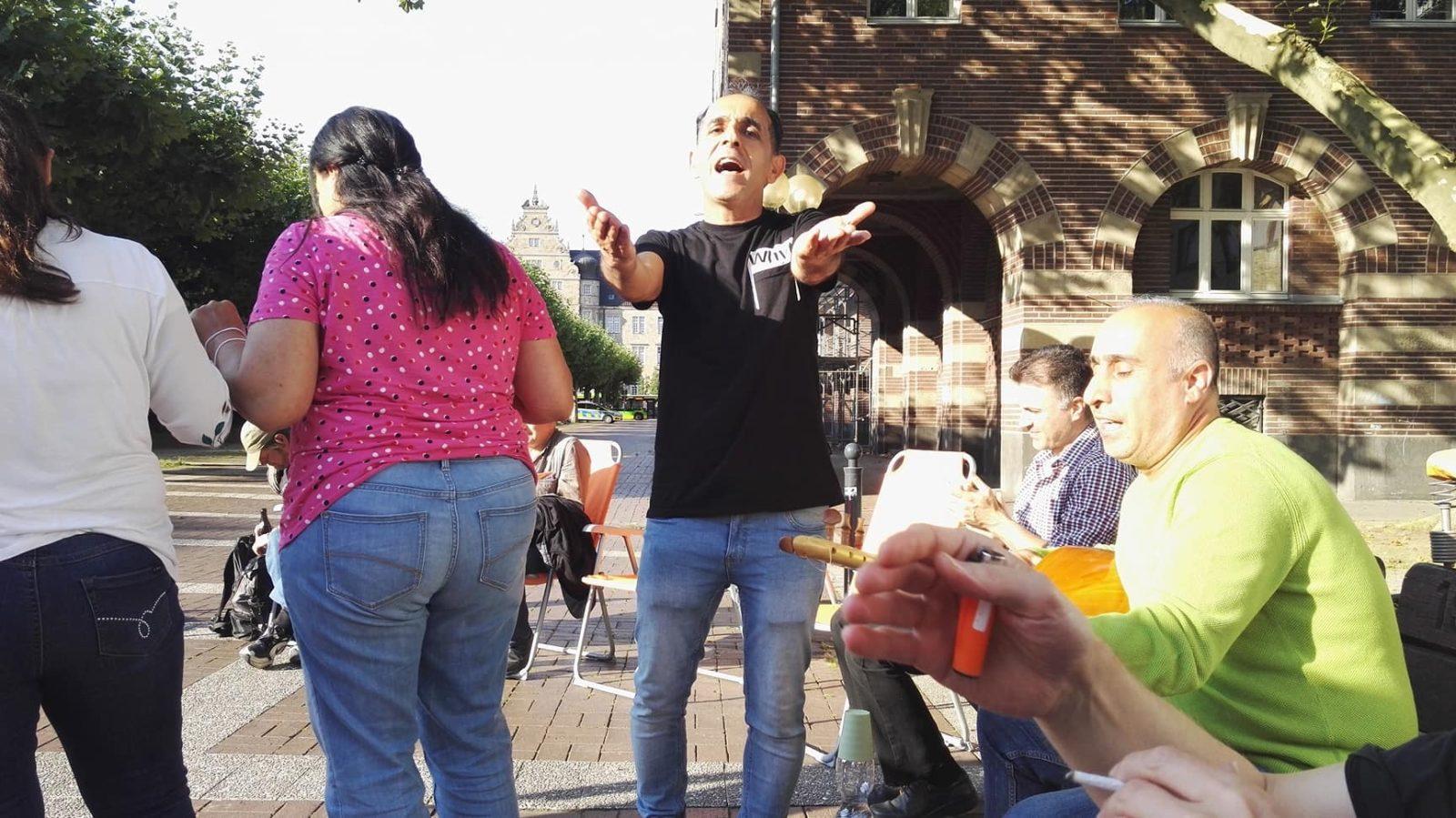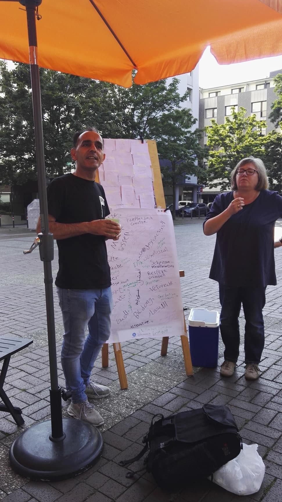 Und tags drauf: FR 20.08.: Integrationskurs, Teil 1: Integration und Kommunikation. Mit einem beeindruckenden Vortrag von Abdo Issa, anschließend weiteren Wortbeiträgen, Diskussion, Gespräch, Musik & Essen. Auf dem wunderschön sonnigen Friedensplatz, am Brunnen :)