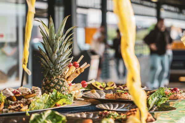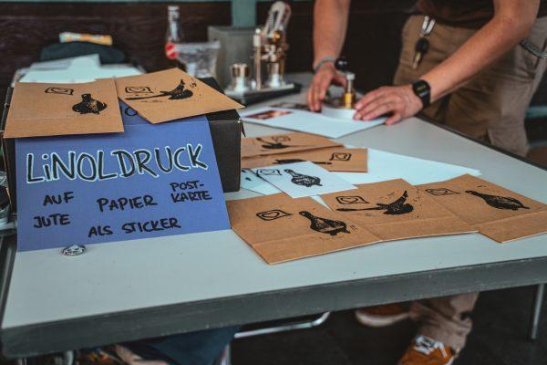 Zugleich war der gesamte Museumsbahnsteig mit Menschen und Aktionen belebt: mit einem bunt bemalten Sound-Container von Klangschichten Ruhr, mit dem komplett ausgefahrenen selbstgebauten Minigolf-Parcours unserer Partner*innen vom Supermarkt der Ideen, mit Sophias Linolschnitt- und Druck- und Button-Press-Werkstatt für alle großen und kleinen Kreativlinge, einem köstlichen Mahl unserer Refugees‘ Kitchen auf schwebendem Tisch, unserer eigenen Bild-/Text- und Video-Ausstellung zu 4 Jahren Utopolis am und im LVR-Museums-Häuschen und Danilos FUni-Bar als kommunikatives Zentrum des Ganzen.